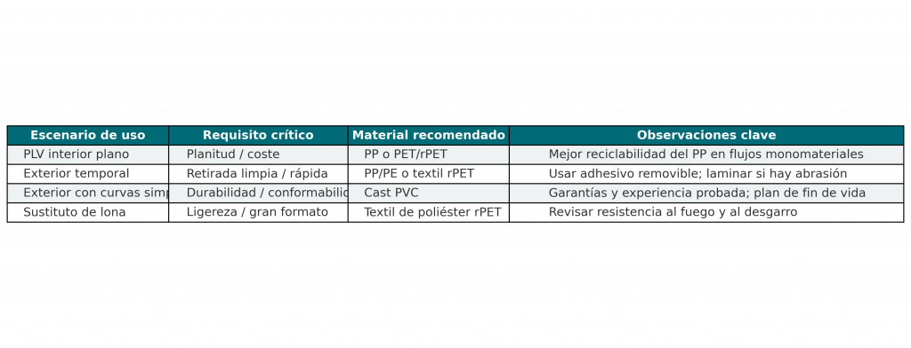 El argumento de venta es sencillo: en interiores y PLV se pueden ofrecer soportes alternativos —PP, PET o textiles de rPET— con buena apariencia y menor impacto ambiental, siempre que el cliente entienda sus limitaciones. Para exteriores exigentes o vehículos, el PVC sigue siendo la opción más segura, pero acompañado de garantías, planes de retirada y programas de reciclaje sectoriales.