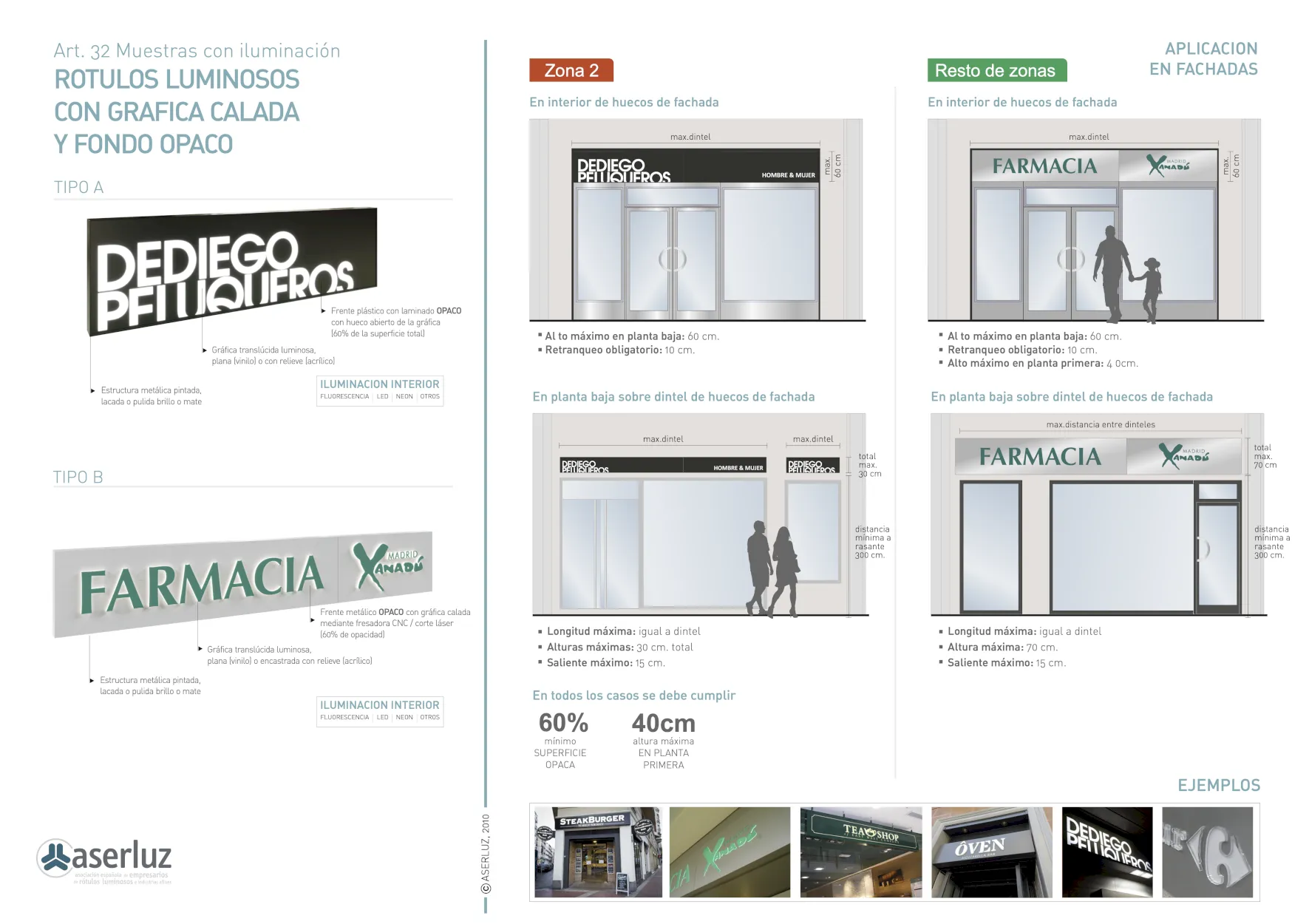 - Ámbito municipal: ordenanzas que regulan publicidad exterior, rótulos en fachada, dimensiones, posiciones, alturas máximas y condiciones específicas por zona.